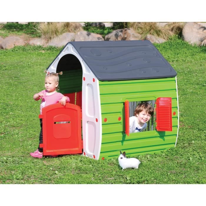 Maison équipée d’une porte de 2 fenêtres + volets et d’une grande fenêtre ouverte à l’arrière – Livrée dans un carton avec poignée – Garçon et Fille – A partir de 2 ans – Livré à l’unité