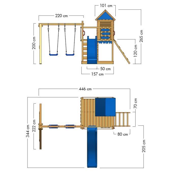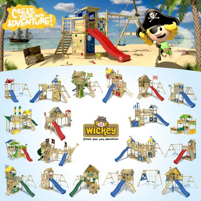 Série Wickey Smart – Bois massif imprégné en autoclave – Qualité et sécurité contrôlées – Plusieurs options de montage – Hauteur de plateforme 120 cm – Dimensions des poteaux 7×7 cm – Poutre du portique 9×9 cm