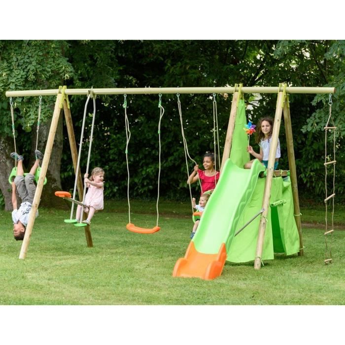 Portique IMPALA de 2,30m de hauteur composé d’1 balançoire – 1 trapèze anneaux, une échelle de corde, un siège bébé vert et orange, 1 face à face et 1 plate-forme de 120 cm de hauteur avec garde-corps tissu + un toboggan de 2,63m 1 cabane en toile – Pieds