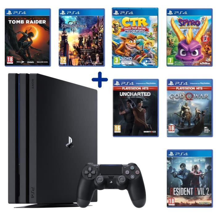 7 avis pour PS4 Pro 1To Noire + God of War + Uncharted + Crash Team Racing + Kingdom Hearts 3 + Resident Evil 2 + Tomb Raider + Spyro