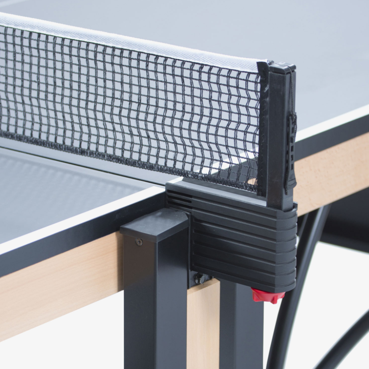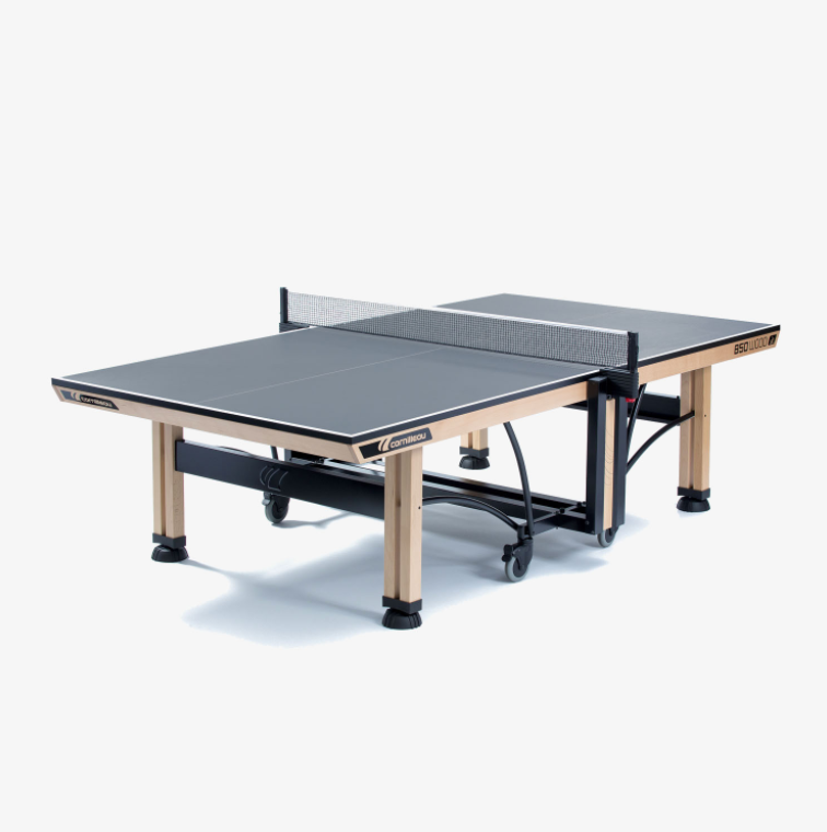 Table de Ping Pong 850 Wood ITTF, coloris gris, pliable avec panneau aggloméré et type d’encadrement en bois. Conçue pour une utilisation intérieure, dispose d’un filet permanent, escamotable et réglable. Équipé d’un système de verrouillage : Double Sécurité Intégrée. Possibilité d’utilisation adaptée fauteuil roulant et de jouer seul. Robuste, stable et équilibrée grâce à ses pieds en bois. Position de jeu : 2740 x 1525 x 760 mm et dimensions pliés : 1835 x 1560 x 650 mm.