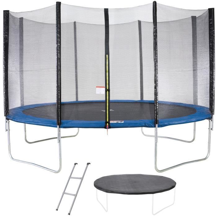 Pack complet Trampoline avec filet de protection, échelle et couverture de propreté – 430 cm de diamètre – Maxi Bleu – Conforme aux normes européennes en vigueur – Poids maximum conseillé : 100 Kg – Garçon et Fille – A partir de 4 ans – Livré à l’unité
